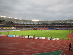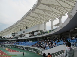 | 長崎県立総合運動公園陸上競技場は、スタジアムの雰囲気的にはミニエコパ、という感じです。今年の国体もあり、県の予算をつぎ込んで整備したのでしょう。 |